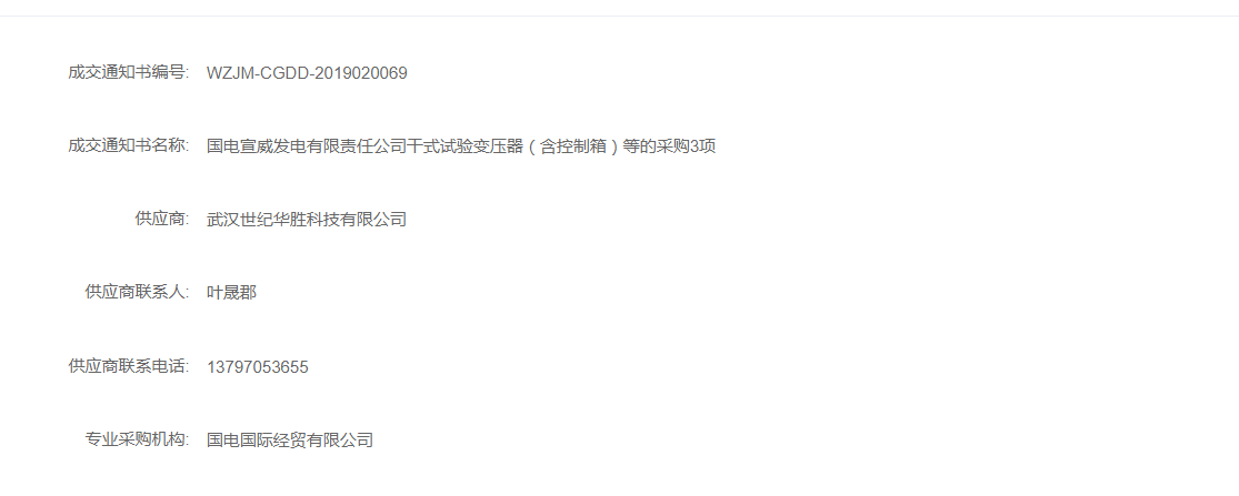 熱烈祝賀:武漢世紀華勝在國電宣威發電有限責任公司干式試驗變壓器(含控制箱)等的采購3項中中標