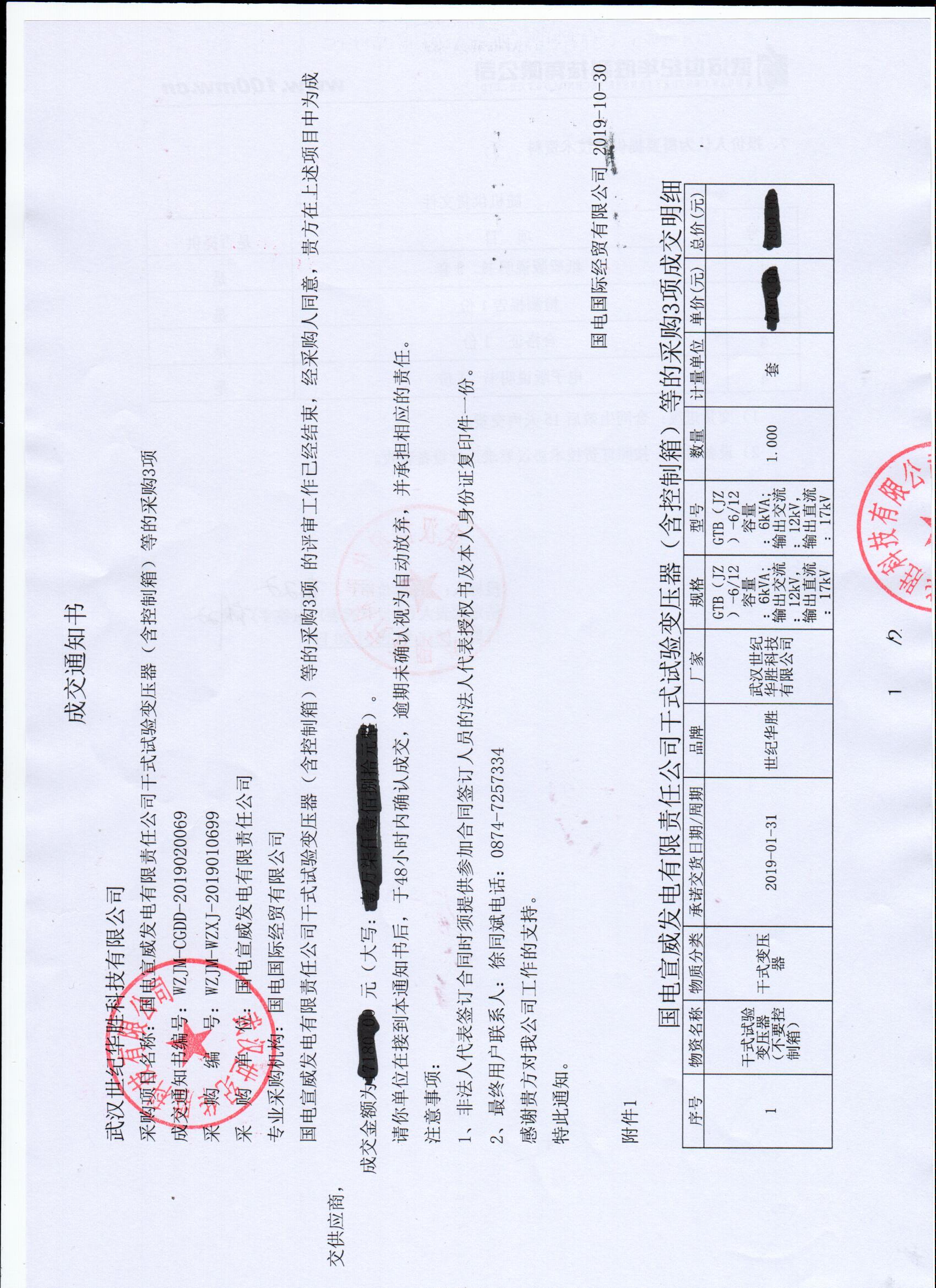 國電宣威發電有限責任公司干式試驗變壓器(含控制箱)等的采購3項